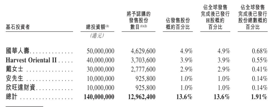 国民技术基石投资者分别为国华人寿、Harvest Oriental II、戴婉琴女士、安江波、欣旺达财资,一共认购1.4亿港元。