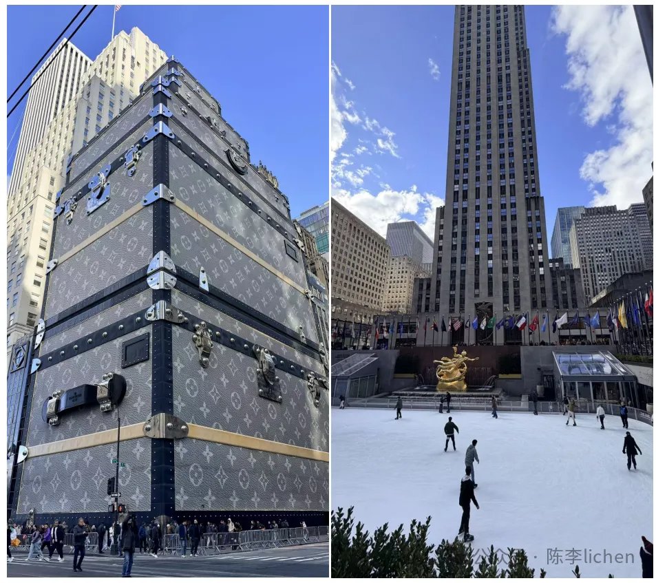 站在第五大道中央拍照LV箱子,及洛克菲勒中心的溜冰场还是熙熙攘攘▼