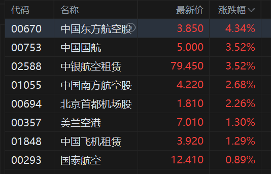 继昨日反弹后港股航空股再度上涨,其中,中国东方航空涨超4%,中国国航涨3.5%,中国南方航空涨近3%,美兰空港、国泰航空跟涨。