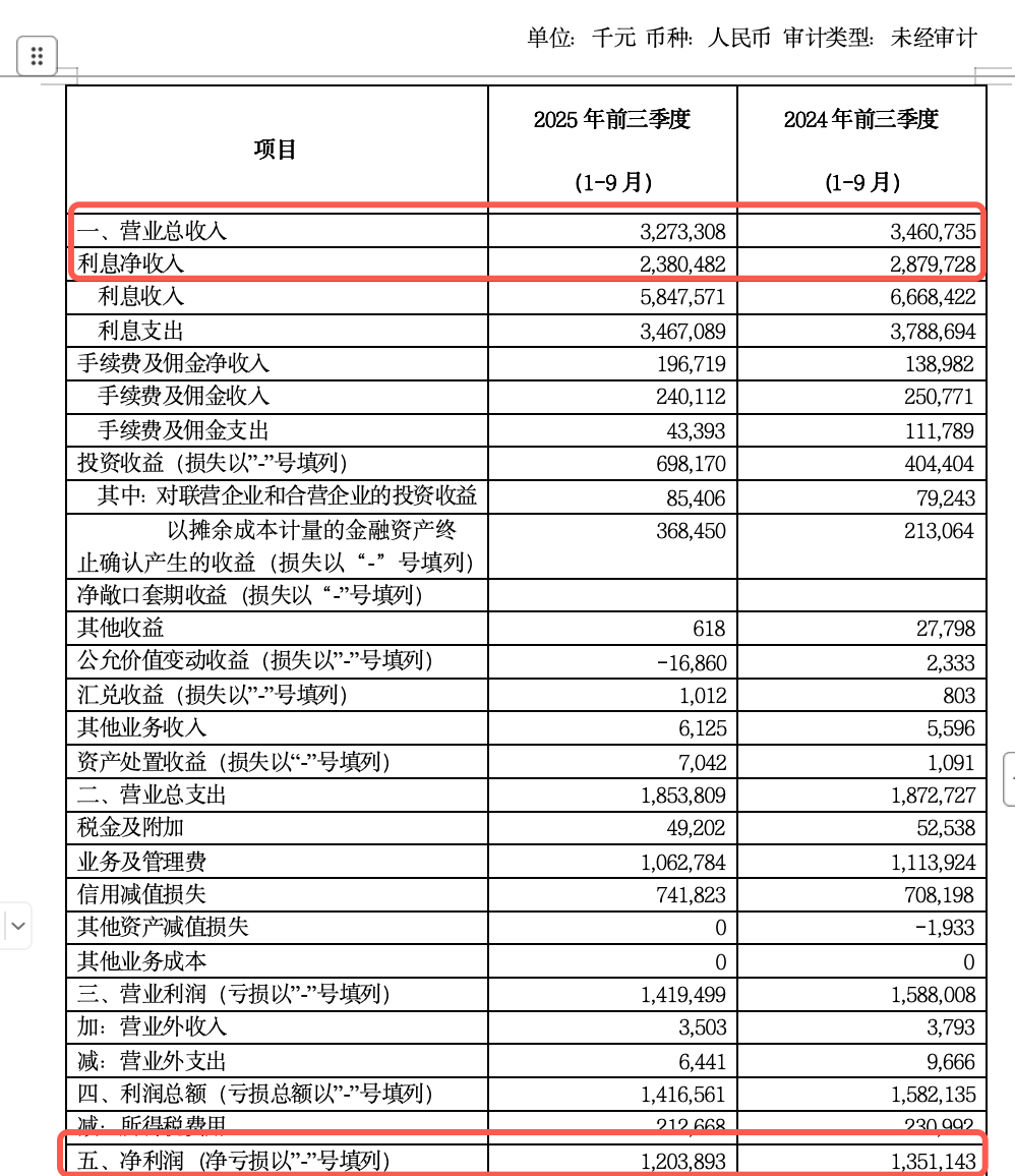 其中,该行净息差下滑幅度明显,从2024年的1.42%降至2025年三季度的1.17%,远低于农商行同期1.58%的均值水平。受此影响,去年前三季度该行利息净收入同比下降17.34%,高度依赖存贷利差的传统盈利模式遭遇冲击。