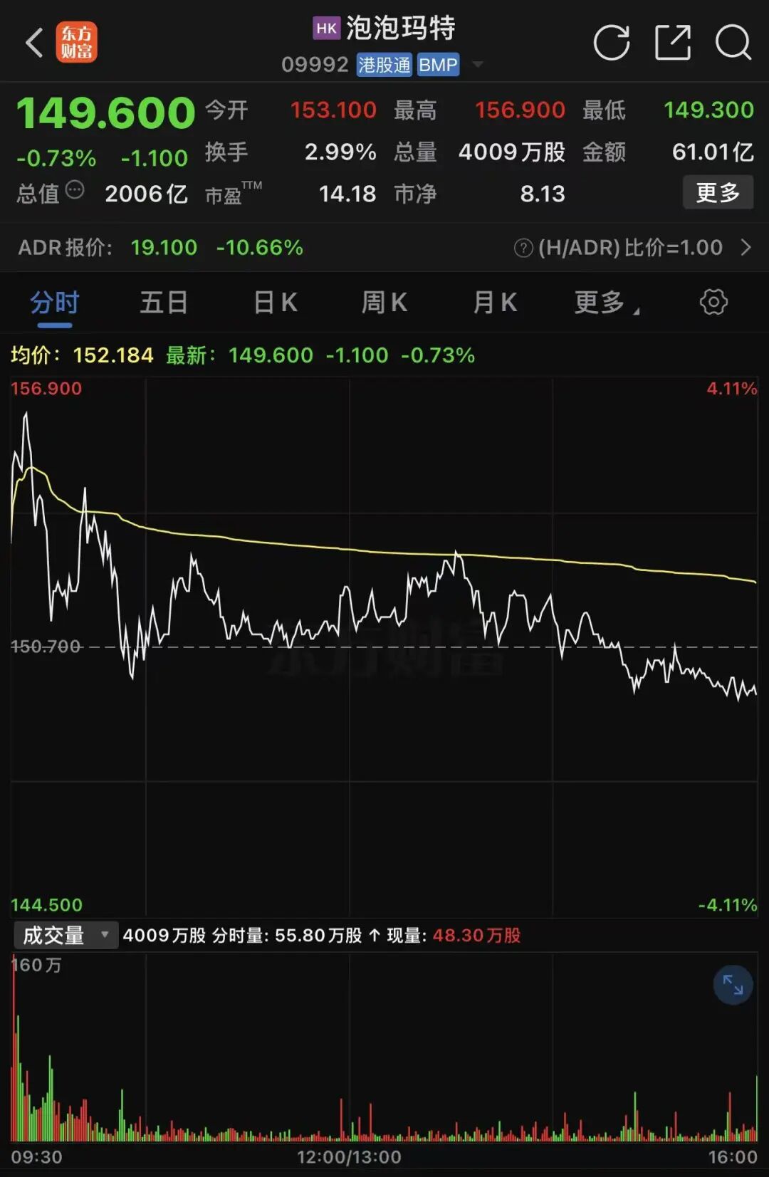 3月26日,泡泡玛特股价跌势未止,继续下挫逾10%。不过,3月27日早盘,泡泡玛特股价开盘出现反弹,截至收盘微跌0.73%,全天呈现震荡走势。