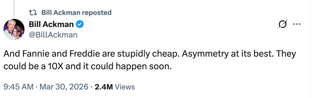 Ackman在X平台发帖称,房利美与房地美提供了“最佳不对称投资机会”,并预言“可能实现十倍回报,且有望在短期内兑现”。
