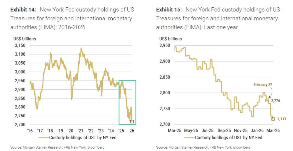 摩根士丹利的数据显示,纽约联储托管账户中的外国官方机构持有量自2月25日以来减少约580亿美元,而同期外国货币当局的逆回购账户(FIMA RRP)仅增加约30亿美元,这意味着相关抛售所得资金可能已被汇回本国,而非留存于美元体系之内。