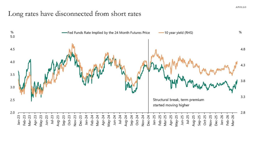 Apollo首席经济学家Torsten Slok亦指出,当前10年期利率中存在一个明显的溢价。在正常美联储预期驱动下,10年期利率应处于3.9%附近,而非目前的4.4%,意味着存在约55个基点的"超额溢价"。