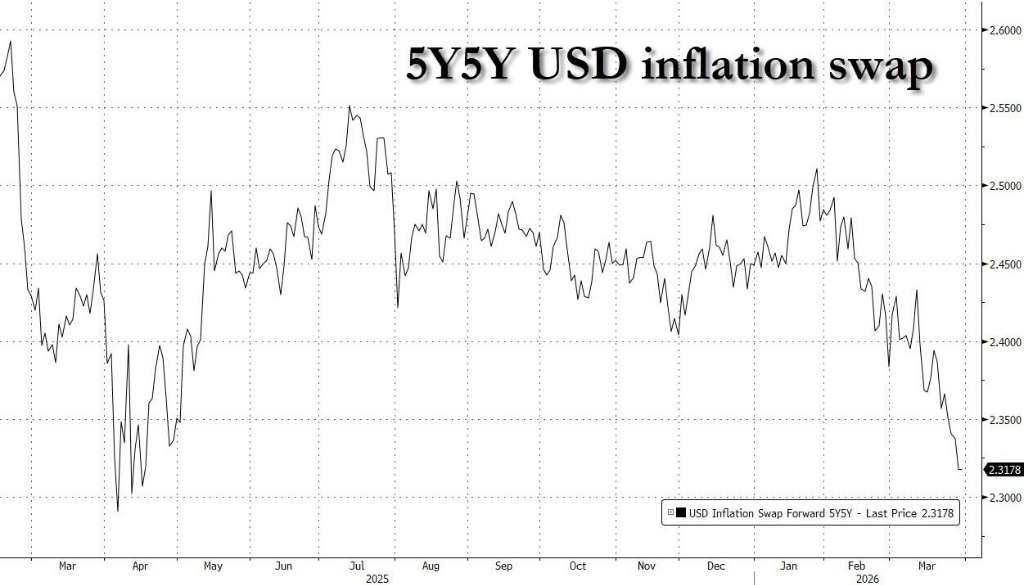然而,过去一周出现了裂缝。尽管能源价格飙升,长期通胀预期几乎没有明显上移。以五年期通胀互换衡量,市场对未来5年的通胀预期已较1月高点下滑约20个基点,回落至去年4月动荡时期的水平。