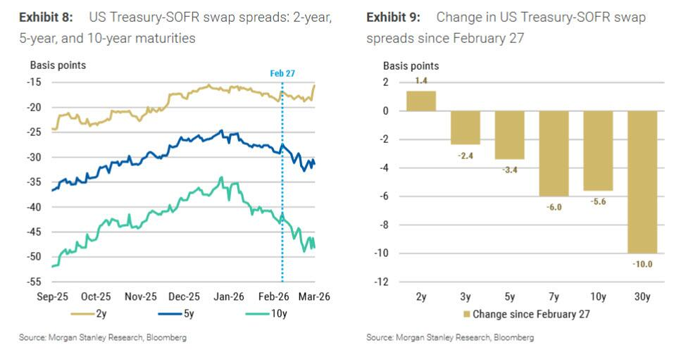 与此同时,美债相对于SOFR互换的表现自2月27日以来持续走弱,甚至连2年期国债也开始落后于SOFR互换,暗示市场已在为美债供给增加的风险定价。