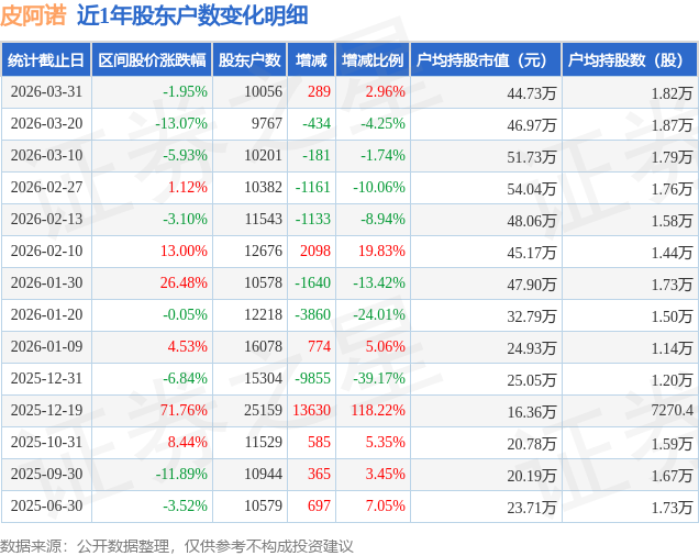 从股价来看,2026年3月20日至2026年3月31日,皮阿诺区间跌幅为1.95%,在此期间股东户数增加289.0户,增幅为2.96%。