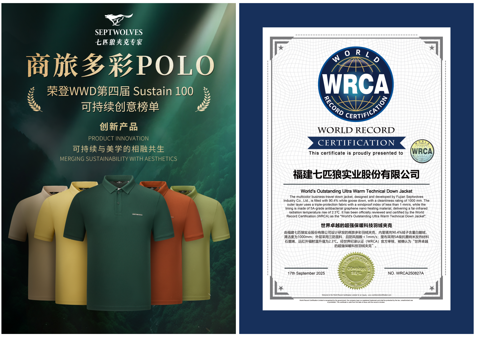 一方面,七匹狼致力于“文化传承”与“科技赋能”双轨并行。2025 年,品牌以 “多彩世遗・时尚泉州” 为主题的时尚大秀,持续推动世界文化遗产与时尚创新的深度融合。同年,品牌旗下POLO衫凭借卓越的抗菌固色性能入选WWD CHINA 2025全球可持续时尚创意榜单,商旅多彩羽绒夹克更是凭借卓越的保暖性能获得WRCA世界记录认证,实现了文化底蕴、科技创新与时尚表达的三位一体。