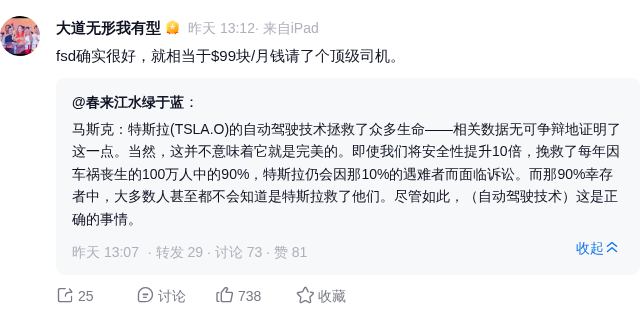 fsd确实很好,就相当于$99块/月钱请了个顶级司机。