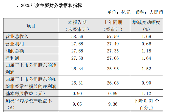 经营业绩方面,2025全年,厦门银行实现营业收入58.56亿元,同比增长1.69%;实现净利润26.34亿元,同比增长1.52%。