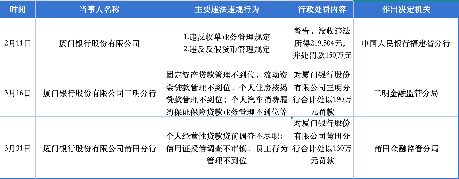 2月11日,因违反收单业务管理和反假货币管理规定,厦门银行领到央行福建省分行开出的150万元罚单,并被没收违法所得21.95万元。短短一个多月后,分支机构罚单接踵而至。3月16日,三明监管分局对厦门银行三明分行处以190万元罚款,违规事由涵盖固定资产贷款、流动资金贷款、个人住房按揭贷款及汽车消费履约保证保险贷款,对公与零售信贷业务均有波及。3月31日,莆田分行再因个人经营性贷款贷前调查不尽职、信用证授信调查不审慎、员工行为管理不到位等问题,领受130万元罚单。
