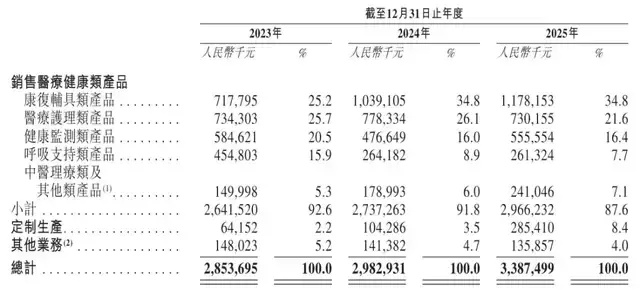 可孚医疗2025年来自康复辅具类产品收入为11.78亿元,占比为34.8%;来自医疗护理类产品收入为7.3亿元,占比为21.6%;来自健康监测类产品收入为5.56亿元,占比为16.4%;来自呼吸支持类产收入为2.61亿元,占比为7.7%;来自中医理疗类及其他类产收入为2.41亿元,占比为7.1%。