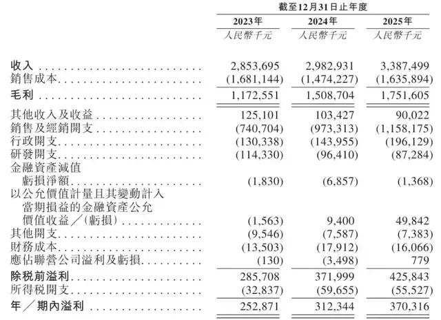 招股书显示,可孚医疗2023年、2024年、2025年营收分别为28.54亿元、29.83亿元、33.87亿元;毛利分别为11.73亿元、15亿元、17.52亿元;期内盈利分别为2.53亿元、3.12亿元、3.7亿元。