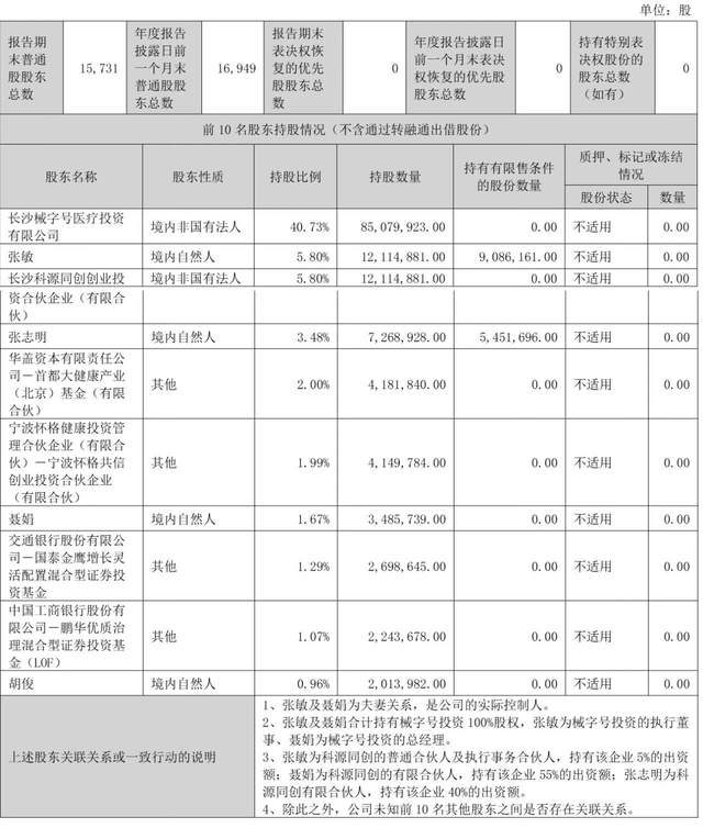 截至2025年12月31日,长沙械字号医疗投资有限公司持股为40.73%,张敏直接持股为5.8%,长沙科源同创创业投资合伙企业(有限合伙)持股为5.8%,张志明持股为3.48%,华盖资本有限责任公司-首都大健康产业(北京)基金(有限合伙)持股为2%,