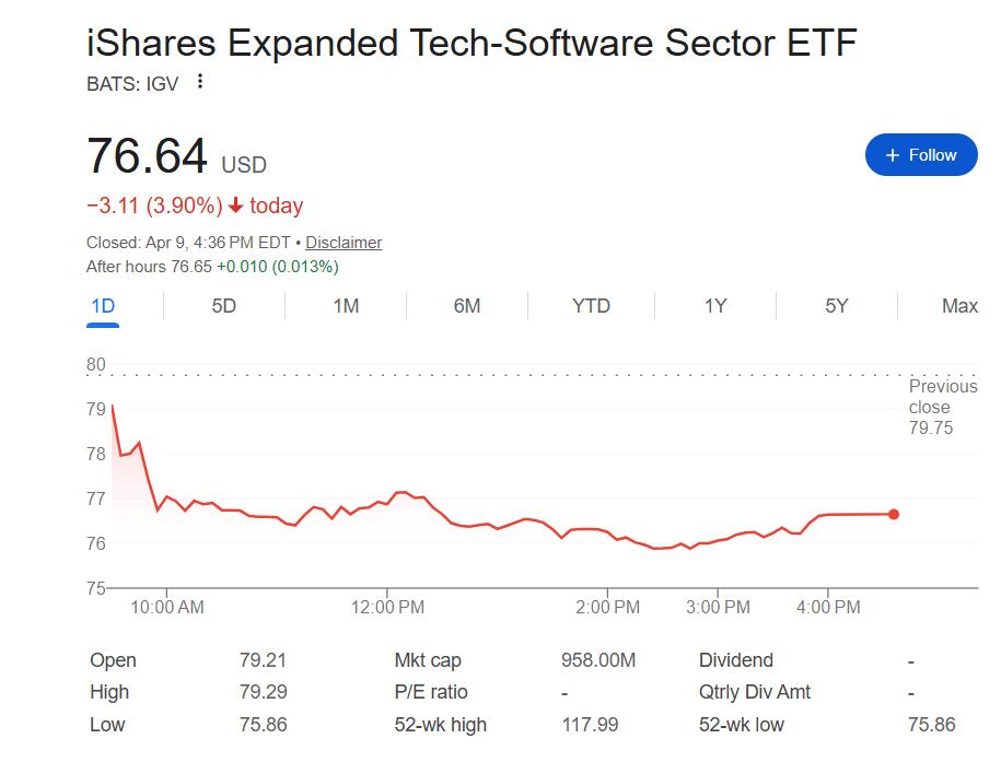 行情数据显示,软件股ETF iShares Expanded Tech-Software Sector ETF(IGV)周四低开低走,美股午盘刷新日低时跌近4.9%,收跌3.9%,两连跌,创2023年11月以来收盘新低。今年以来,该ETF的累计跌幅已接近三成。