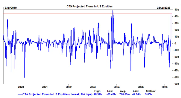 这种趋势即将逆转。高盛交易员的模型显示,无论市场走向如何,CTA都将在未来一周和一个月内成为美国股票的净买家。高盛策略师Paul Leyzerovich写道,即使在市场横盘整理的情况下,未来一周的需求也可能达到约450亿美元,这将是有史以来规模最大的资金流入之一。