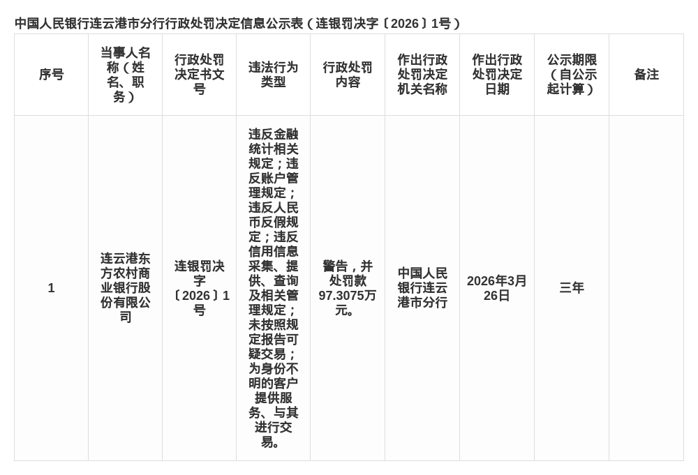 蓝鲸新闻4月12日讯,近日,中国人民银行连云港市分行发布了一则行政处罚决定,剑指连云港东方农村商业银行股份有限公司。