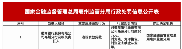 罚单显示,徽商银行股份有限公司亳州分行的主要违法违规事实(案由)为:违规发放贷款。