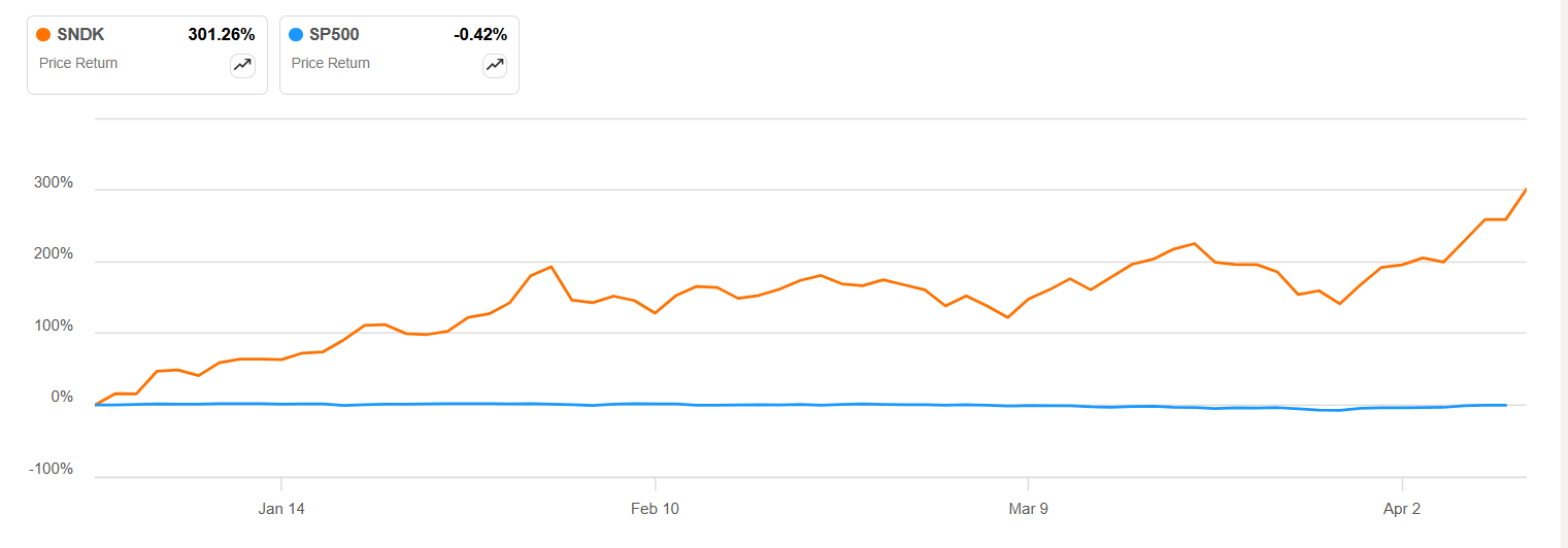 4月14日,截至周一美股市场收盘,全球SSD存储产品领军者闪迪股价延续2025年以来的无比强劲涨势,截至收盘大涨近12%,其股价自2026年初以来可谓暴涨超300%大幅跑赢全球股市基准指数。在整个2025年,闪迪股价涨幅高达惊人的580%,今年则仍在上演“全球存储芯片神话”般的史诗级涨势,乃全球股市毋庸置疑的AI算力基础设施主题“超级大牛股”。