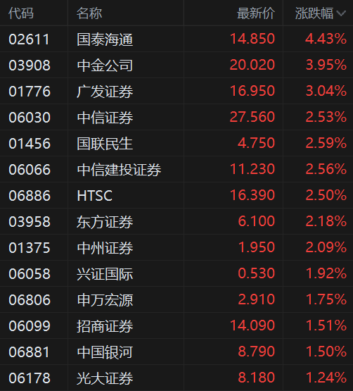 4月16日,港股中资券商股继续活跃,其中,国泰海通涨4.5%,中金公司绩后涨超4%,广发证券涨3%录得5连升,中信证券、国联民生、中信建投均涨2.5%,东方证券、申万宏源、招商证券、中国银河均涨超1.5%以上。