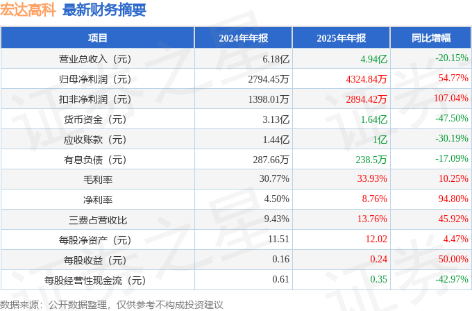 据证券之星公开数据整理,近期宏达高科(002144)发布2025年年报。截至本报告期末,公司营业总收入4.94亿元,同比下降20.15%,归母净利润4324.84万元,同比上升54.77%。按单季度数据看,第四季度营业总收入1.02亿元,同比下降42.57%,第四季度归母净利润-1614.4万元,同比上升57.05%。本报告期宏达高科三费占比上升明显,财务费用、销售费用和管理费用总和占总营收同比增幅达45.92%。