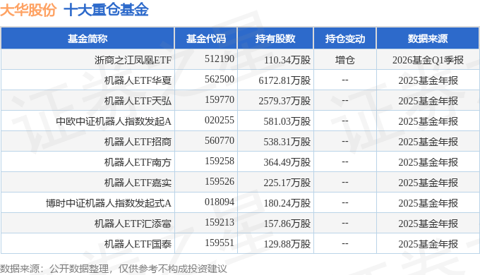 持有大华股份最多的基金为浙商之江凤凰ETF,目前规模为2.88亿元,最新净值2.8649(4月17日),较上一交易日下跌0.24%,近一年上涨56.7%。该基金现任基金经理为周文超。