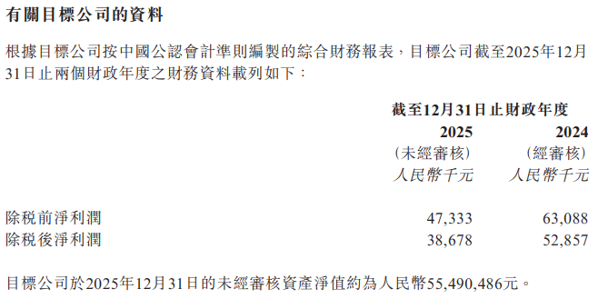 目标公司财务数据方面,公告显示,2024年其除税前净利润为6308.8万元,除税后净利润为5285.7万元;2025年其除税前净利润为4733.3万元,除税后净利润为3867.8万元。截至2025年12月31日,目标公司未经审核资产净值约为5549.0486万元。