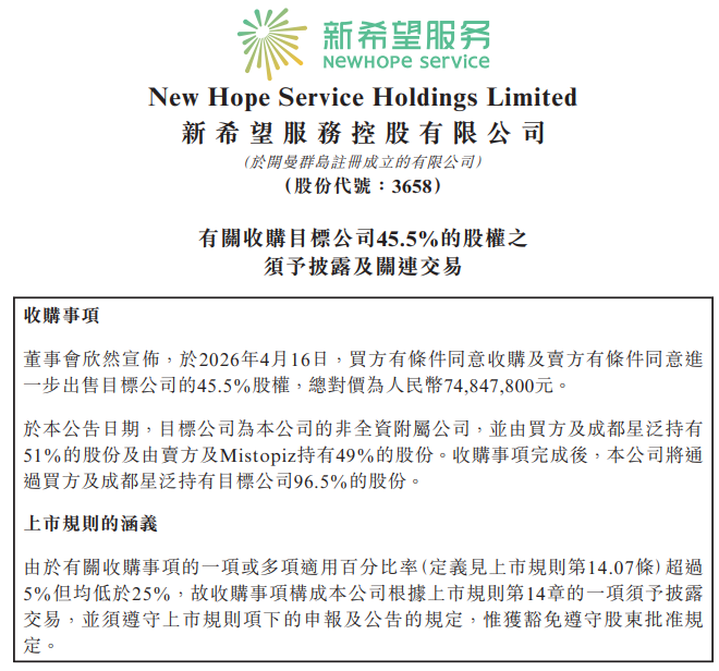 4月17日,刘永好家族旗下港股公司——新希望服务(03658.HK)发布公告,董事会欣然宣布,于2026年4月16日,公司有条件同意收购及卖方有条件同意进一步出售目标公司成都明宇环球商业管理有限公司(以下简称:明宇环球商业)的45.5%股权,总对价为人民币7484.78万元。