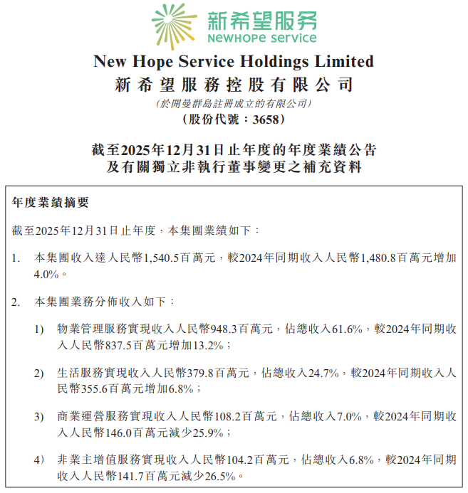 年报显示,2025年,新希望服务物业管理服务实现收入9.483亿元,占总收入61.6%,较2024年同期收入增加13.2%;生活服务实现收入3.798亿元,占总收入24.7%,较2024年同期增加6.8%;商业运营服务实现收入1.082亿元,占总收入7%,较2024年同期收入减少25.9%;非业主增值服务实现收入1.042亿元,占总收入6.8%,较2024年同期减少26.5%。