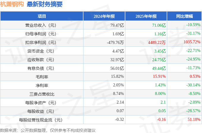 据证券之星公开数据整理,近期杭萧钢构(600477)发布2025年年报。截至本报告期末,公司营业总收入71.06亿元,同比下降10.59%,归母净利润1.16亿元,同比下降31.17%。按单季度数据看,第四季度营业总收入13.37亿元,同比下降32.07%,第四季度归母净利润-3252.63万元,同比上升10.51%。本报告期杭萧钢构公司应收账款体量较大,当期应收账款占最新年报归母净利润比达2128.05%。