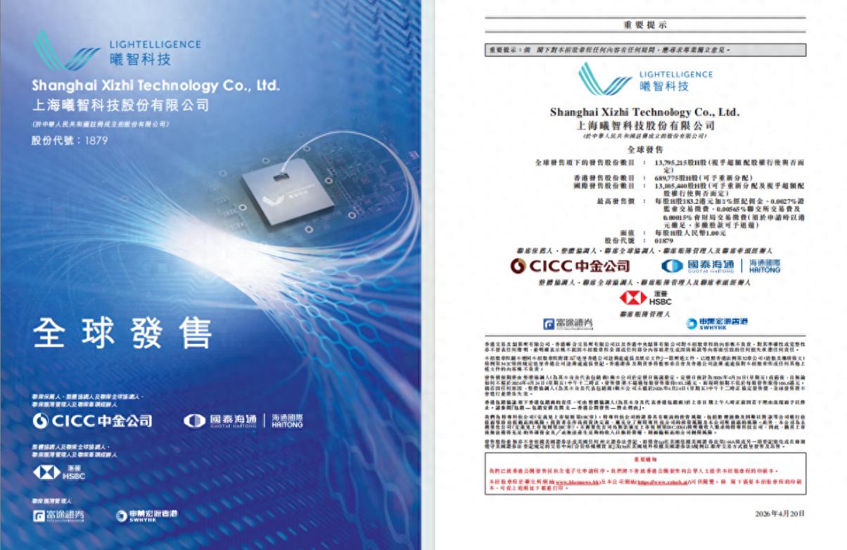 光电混合算力提供商——上海曦智科技股份有限公司(简称“曦智科技”)今日正式启动H股全球发售计划,将于4月23日截止认购,并预计于4月48日正式以股票代码“01879.HK”挂牌上市,全力冲刺全球资本市场“AI硅光芯片第一股”。