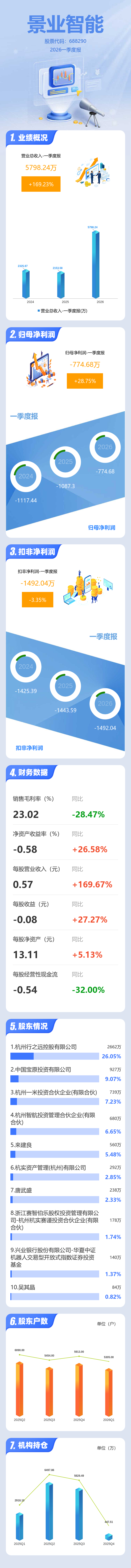 证券之星消息,景业智能2026年一季报显示,一季度公司主营收入5798.24万元,同比上升169.24%;归母净利润-774.68万元,同比上升28.75%;扣非净利润-1492.04万元,同比下降3.36%;负债率25.71%,投资收益735.65万元,财务费用-1.73万元,毛利率23.02%。