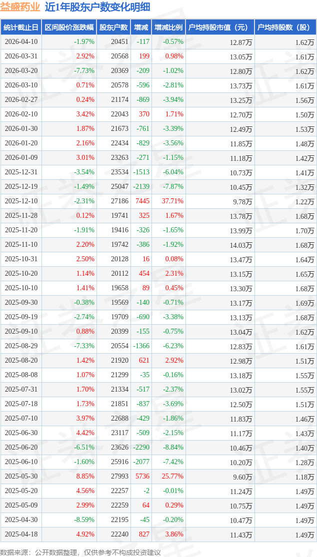 从股价来看,2026年3月31日至2026年4月10日,益盛药业区间跌幅为1.97%,在此期间股东户数减少117.0户,减幅为0.57%。
