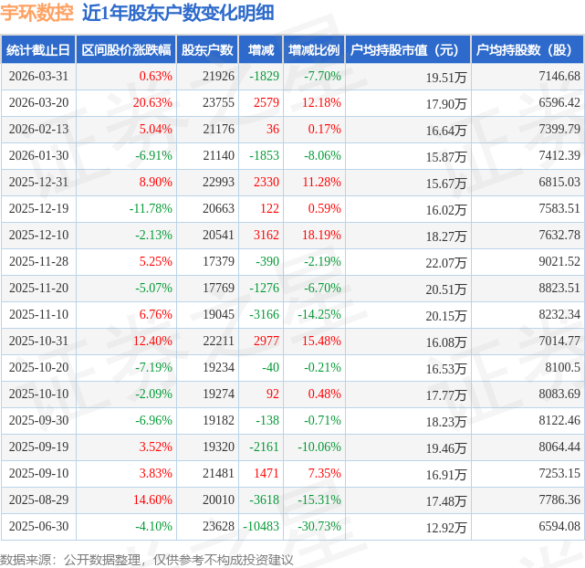 从股价来看,2026年3月20日至2026年3月31日,宇环数控区间涨幅为0.63%,在此期间股东户数减少1829.0户,减幅为7.7%。