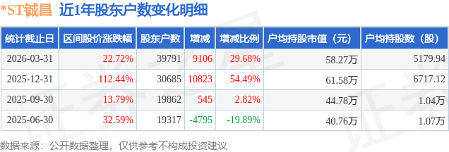 从股价来看,2025年12月31日至2026年3月31日,*ST铖昌区间涨幅为22.72%,在此期间股东户数增加9106.0户,增幅为29.68%。
