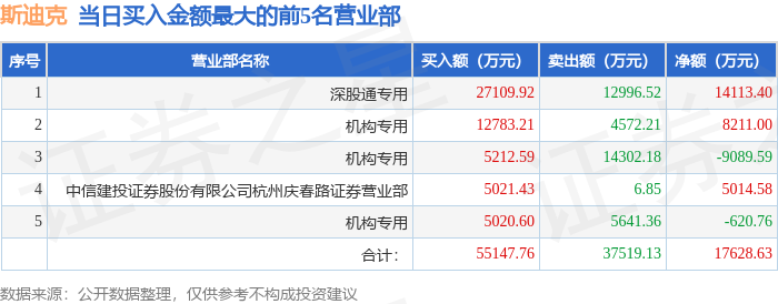 证券小知识:龙虎榜是交易所披露的竞价交易公开信息,现身龙虎榜的个股都是当日最为活跃的个股,是投资者日常重点关注的数据。交易所公布当日买入金额和卖出金额前五名的席位,其中一些席位代表特殊意义,如机构专用席位是指基金专用席位、券商自营专用席位、社保专用席位、券商理财专用席位、保险机构专用席位、保险机构租用席位、QFII专用席位等机构投资者买卖证券的专用通道和席位。深股通专用、沪股通专用为北向资金的交易席位。
