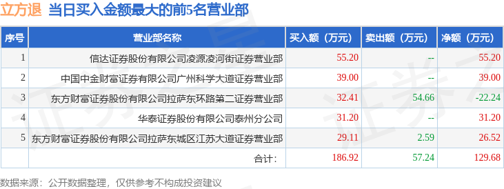 证券之星消息,沪深交易所2026年4月17日公布的交易公开信息显示,立方退(300344)因退市整理期登上龙虎榜。此次是近5个交易日内第5次上榜。
