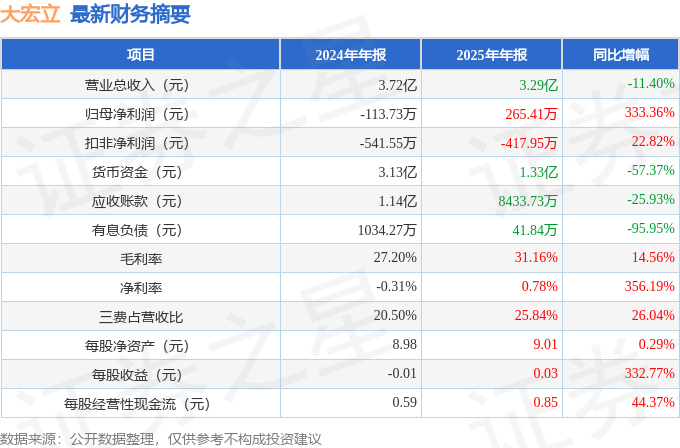 据证券之星公开数据整理,近期大宏立(300865)发布2025年年报。截至本报告期末,公司营业总收入3.29亿元,同比下降11.4%,归母净利润265.41万元,同比上升333.36%。按单季度数据看,第四季度营业总收入8633.94万元,同比上升23.67%,第四季度归母净利润-776.7万元,同比上升61.12%。本报告期大宏立盈利能力上升,毛利率同比增幅14.56%,净利率同比增幅356.19%。