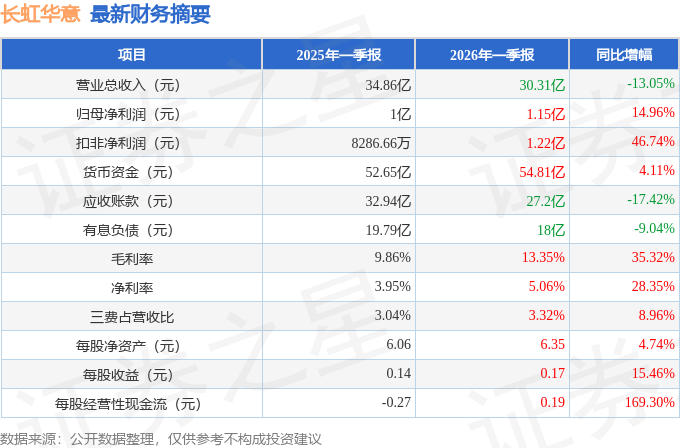 据证券之星公开数据整理,近期长虹华意(000404)发布2026年一季报。截至本报告期末,公司营业总收入30.31亿元,同比下降13.05%,归母净利润1.15亿元,同比上升14.96%。按单季度数据看,第一季度营业总收入30.31亿元,同比下降13.05%,第一季度归母净利润1.15亿元,同比上升14.96%。本报告期长虹华意盈利能力上升,毛利率同比增幅35.32%,净利率同比增幅28.35%。