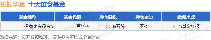 持有长虹华意最多的基金为招商瑞庆混合A,目前规模为3.28亿元,最新净值1.0986(4月17日),较上一交易日上涨0.1%,近一年上涨7.64%。该基金现任基金经理为余芽芳 王垠。