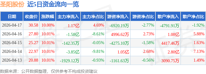 证券之星消息,圣阳股份4月17日涨停收盘,收盘价30.58元。该股于9点33分涨停,14次打开涨停,截止收盘封单资金为2.4亿元,占其流通市值1.74%。