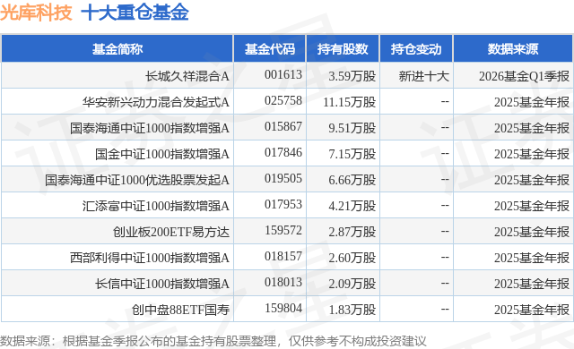 根据2026基金Q1季报公募基金重仓股数据,重仓该股的公募基金共1家,其中持有数量最多的公募基金为长城基金的长城久祥混合A。长城久祥混合A目前规模为0.44亿元,最新净值2.3016(4月16日),较上一交易日上涨3.26%,近一年上涨145.37%。该公募基金现任基金经理为刘疆。刘疆在任的基金产品包括:长城新兴产业混合A,管理时间为2025年1月17日至今,期间收益率为9.88%。
