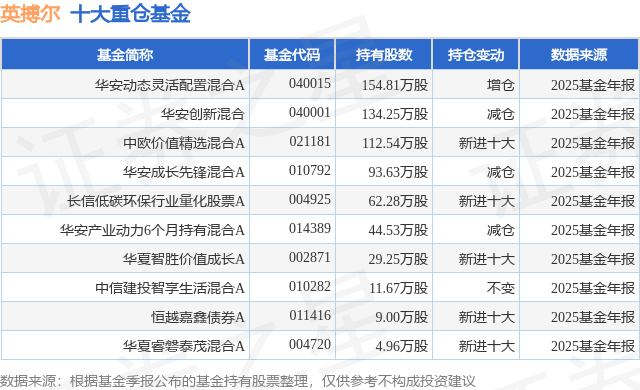 根据2025基金年报公募基金重仓股数据,重仓该股的公募基金共18家,其中持有数量最多的公募基金为华安基金的华安动态灵活配置混合A。华安动态灵活配置混合A目前规模为8.38亿元,最新净值4.952(4月16日),较上一交易日上涨1.31%,近一年上涨45.99%。该公募基金现任基金经理为熊哲颖。熊哲颖在任的基金产品包括:华安新能源主题混合A,管理时间为2023年7月17日至今,期间收益率为59.76%;华安先进制造混合发起式A,管理时间为2025年1月21日至今,期间收益率为10.05%;华安低碳生活混合A,管理时间为2025年5月6日至今,期间收益率为53.44%;