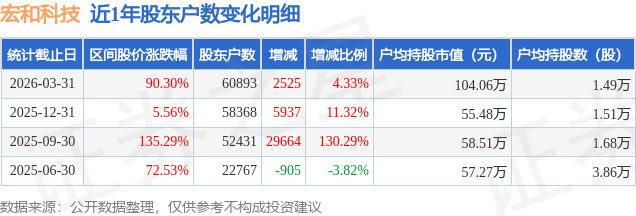 从股价来看,2025年12月31日至2026年3月31日,宏和科技区间涨幅为90.3%,在此期间股东户数增加2525.0户,增幅为4.33%。