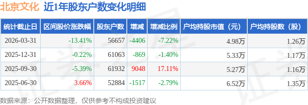 从股价来看,2025年12月31日至2026年3月31日,北京文化区间跌幅为13.41%,在此期间股东户数减少4406.0户,减幅为7.22%。