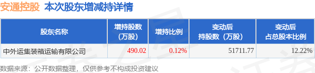 证券之星消息,4月20日安通控股发布公告《安通控股:关于持股5%以上股东增持股份结果公告》,其股东中外运集装箱运输有限公司于2026年4月18日至2026年4月20日间合计增持490.02万股,占公司目前总股本的0.1158%,变动期间该股股价上涨1.12%,截止4月20日收盘报4.52元。