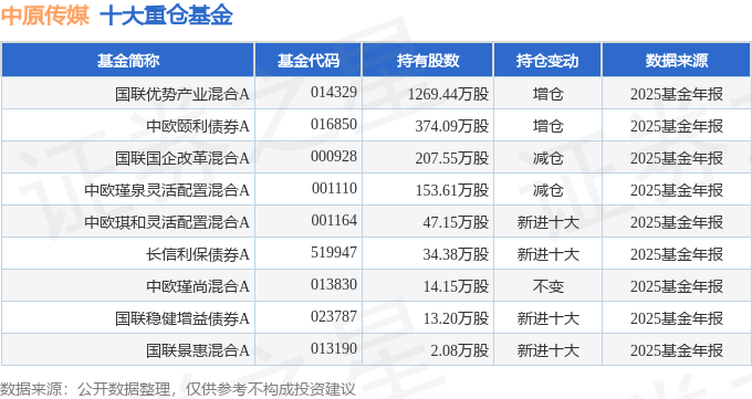 持有中原传媒最多的基金为国联优势产业混合A,目前规模为18.04亿元,最新净值1.1926(4月17日),较上一交易日下跌0.38%,近一年上涨17.74%。该基金现任基金经理为郑玲。