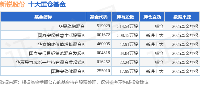 根据2025基金年报公募基金重仓股数据,重仓该股的公募基金共6家,其中持有数量最多的公募基金为华夏基金的华夏稳增混合。华夏稳增混合目前规模为13.01亿元,最新净值4.53(4月17日),较上一交易日上涨2.1%,近一年上涨65.63%。该公募基金现任基金经理为彭海伟。彭海伟在任的基金产品包括:华夏景气成长一年持有混合发起式A,管理时间为2024年3月28日至今,期间收益率为91.52%;华夏行业混合(LOF),管理时间为2026年1月13日至今,期间收益率为3.26%。