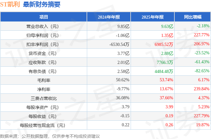 据证券之星公开数据整理,近期ST凯利(300326)发布2025年年报。截至本报告期末,公司营业总收入9.63亿元,同比下降2.18%,归母净利润1.35亿元,同比上升227.77%。按单季度数据看,第四季度营业总收入1.75亿元,同比下降25.26%,第四季度归母净利润6363.32万元,同比上升139.37%。本报告期ST凯利盈利能力上升,毛利率同比增幅6.17%,净利率同比增幅239.84%。