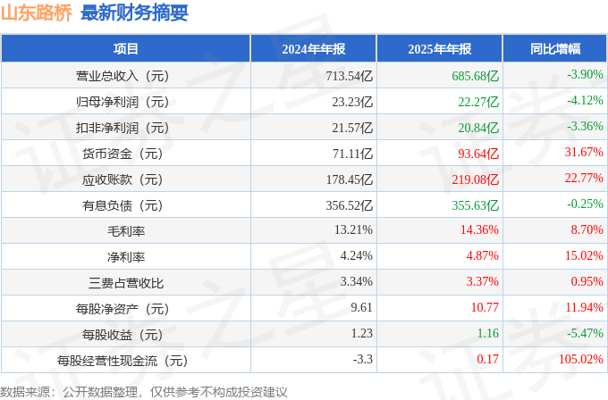 据证券之星公开数据整理,近期山东路桥(000498)发布2025年年报。截至本报告期末,公司营业总收入685.68亿元,同比下降3.9%,归母净利润22.27亿元,同比下降4.12%。按单季度数据看,第四季度营业总收入272.14亿元,同比下降5.08%,第四季度归母净利润8.18亿元,同比下降5.56%。本报告期山东路桥盈利能力上升,毛利率同比增幅8.75%,净利率同比增幅15.05%。